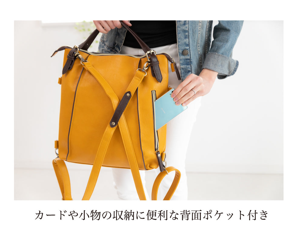 - 内ポケットの他に背面ポケット付きで携帯やお財布などさっと取り出したいものの収納にぴったりです。