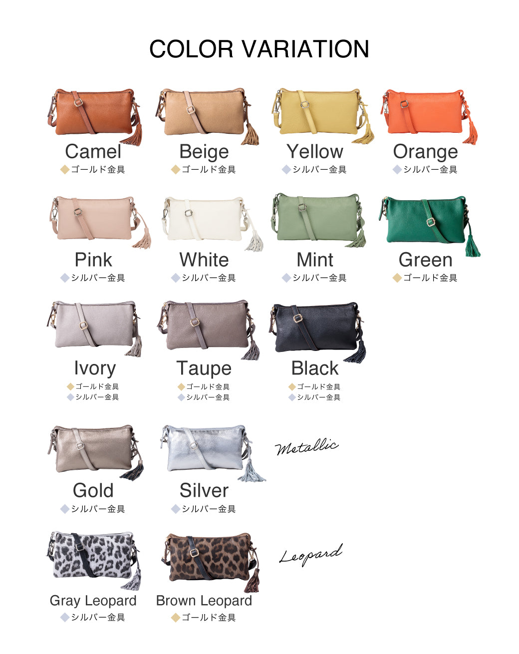 | 表素材 | 牛革、ナイロン、合成皮革(ヒョウ柄は牛床革) |