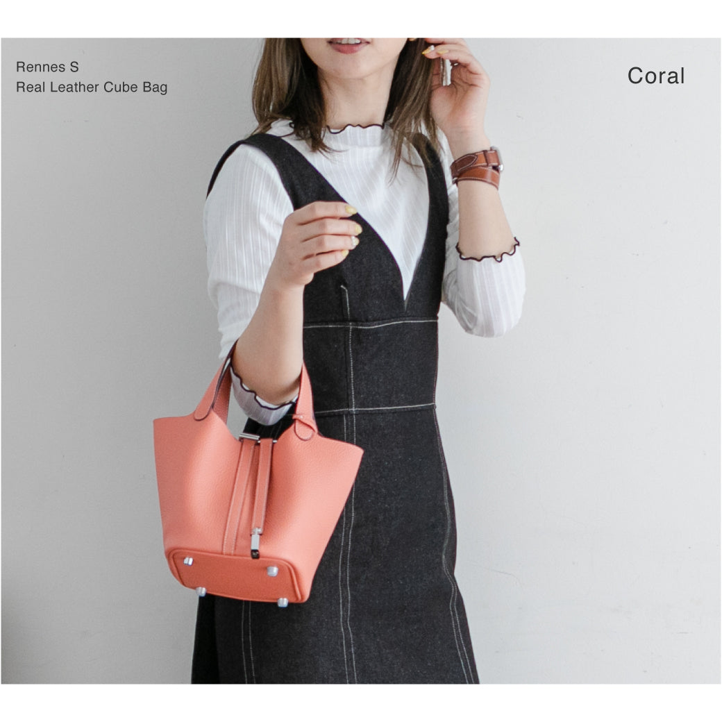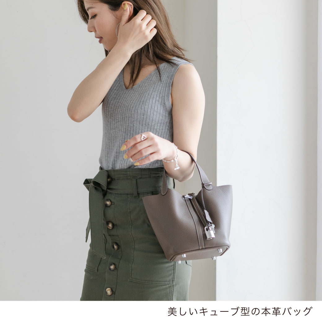 - 上質な牛革を使った美しいキューブ型ハンドバッグ。カデナとクロシェットが高級感抜群で大人っぽいデザインです。